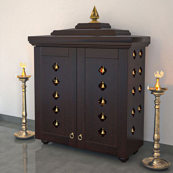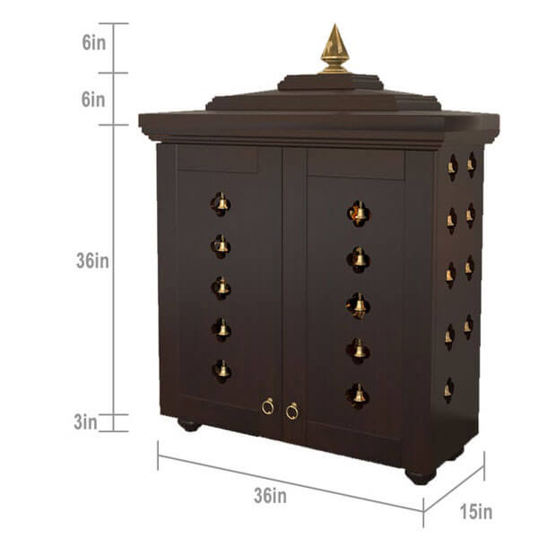 Handcrafted solid wood free standing pooja mandir with Espresso finish, decorative brass bells, and antique brass handle on shutter which enhances your prayer space.
